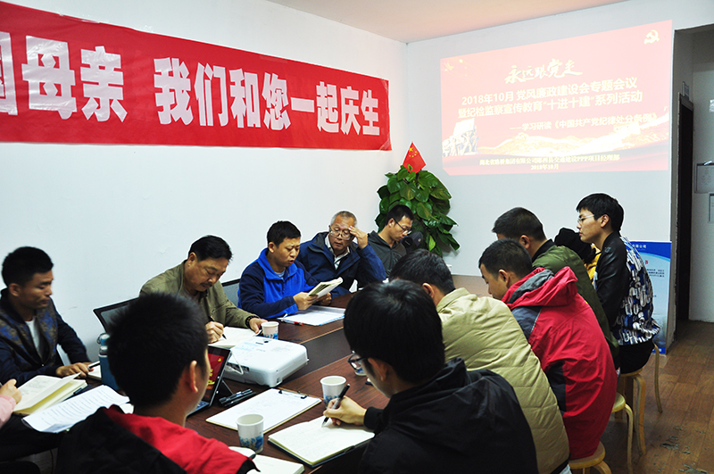 10月19日,為堅持全面從嚴治黨,杜絕貪腐現(xiàn)象的滋生,湖北路橋鄖西PPP項目積極響應集團公司黨委的廉政號召,組織開展了2018年10月黨風廉政建設專題會議暨紀檢監(jiān)察宣傳教育“十進十建”系列活動。