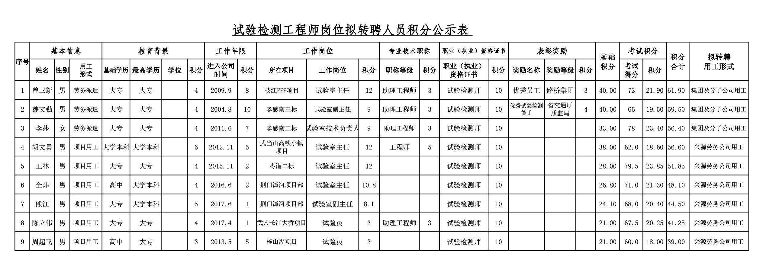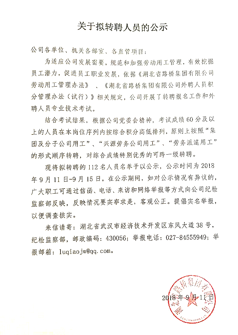 湖北路橋2018年關(guān)于擬轉(zhuǎn)聘人員的公示