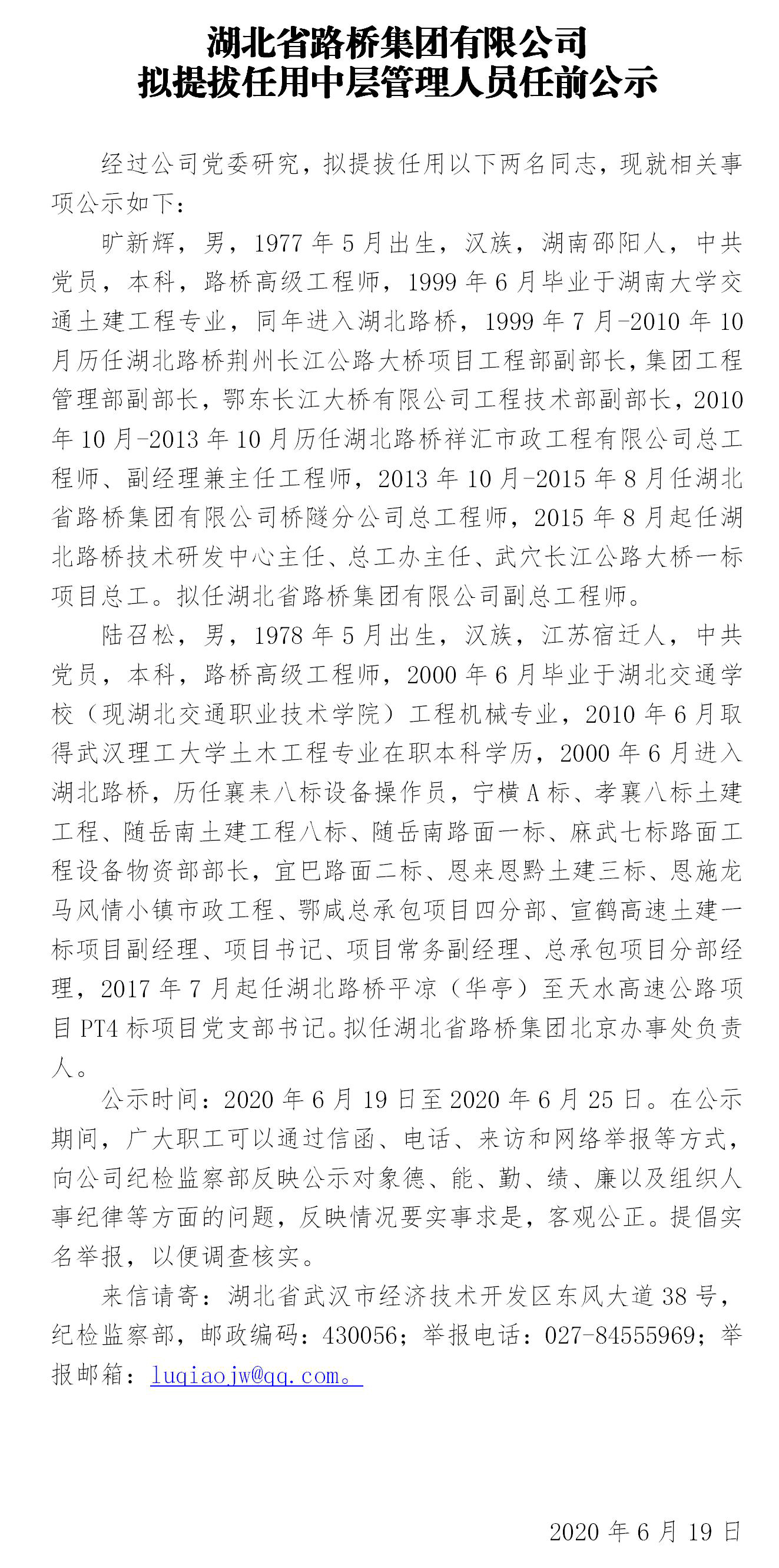 湖北省路橋集團(tuán)有限公司擬提拔任用中層管理人員任前公示
