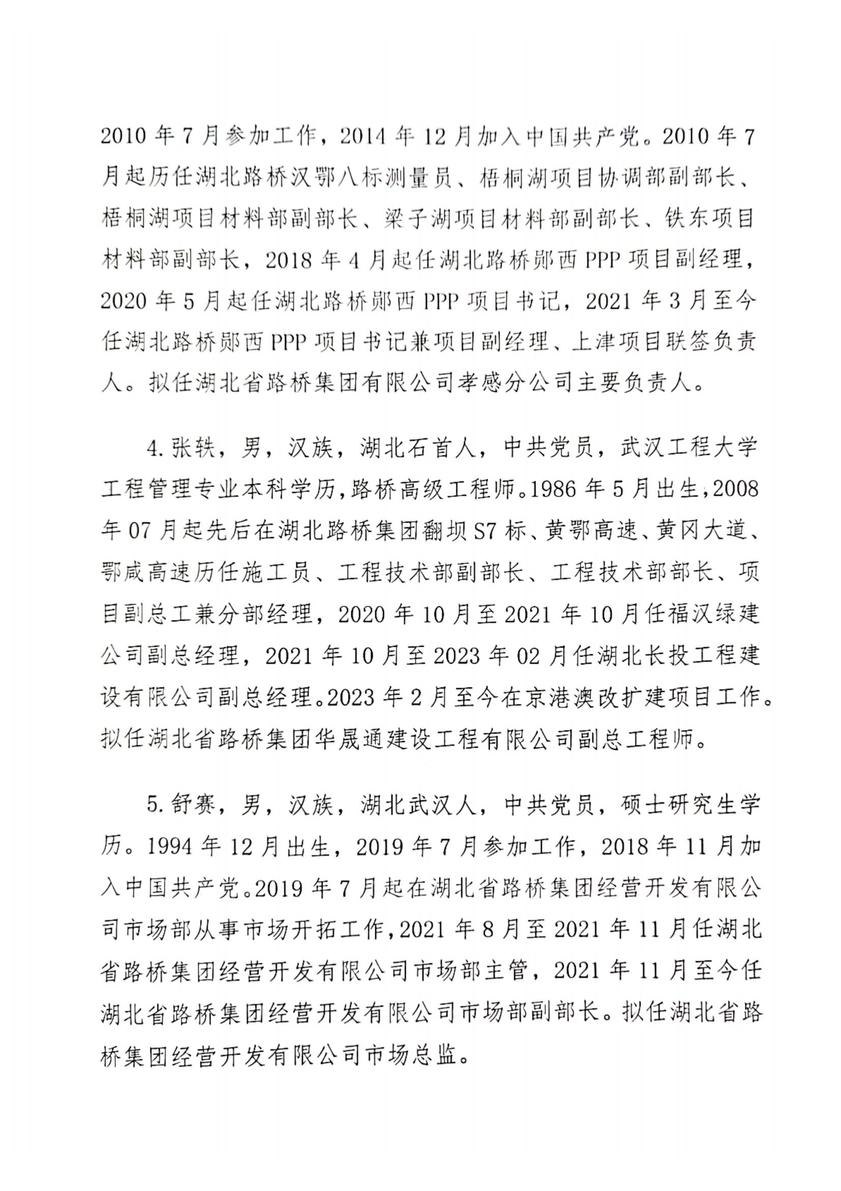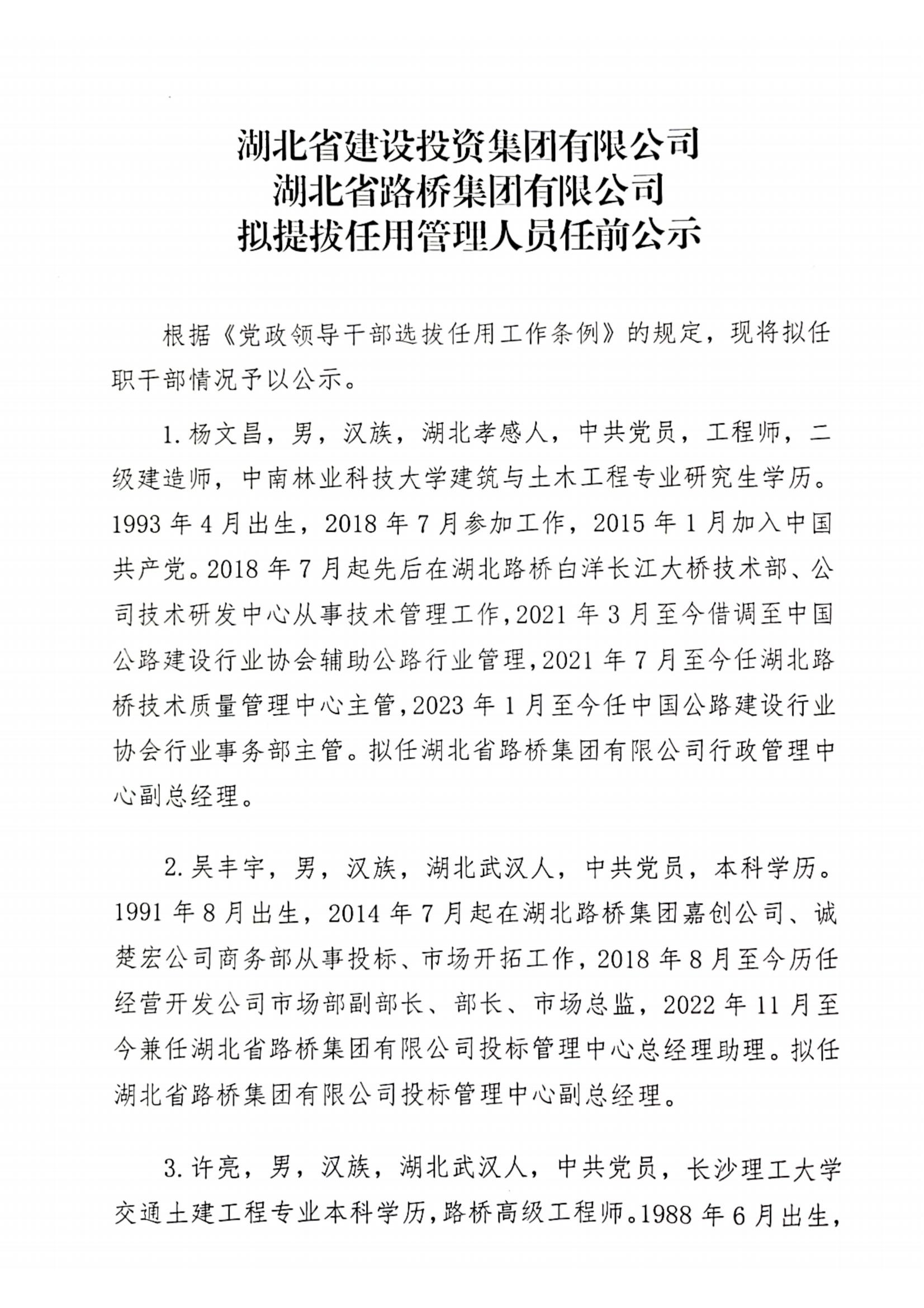 湖北省路橋集團(tuán)有限公司擬提拔任用管理人員任前公示