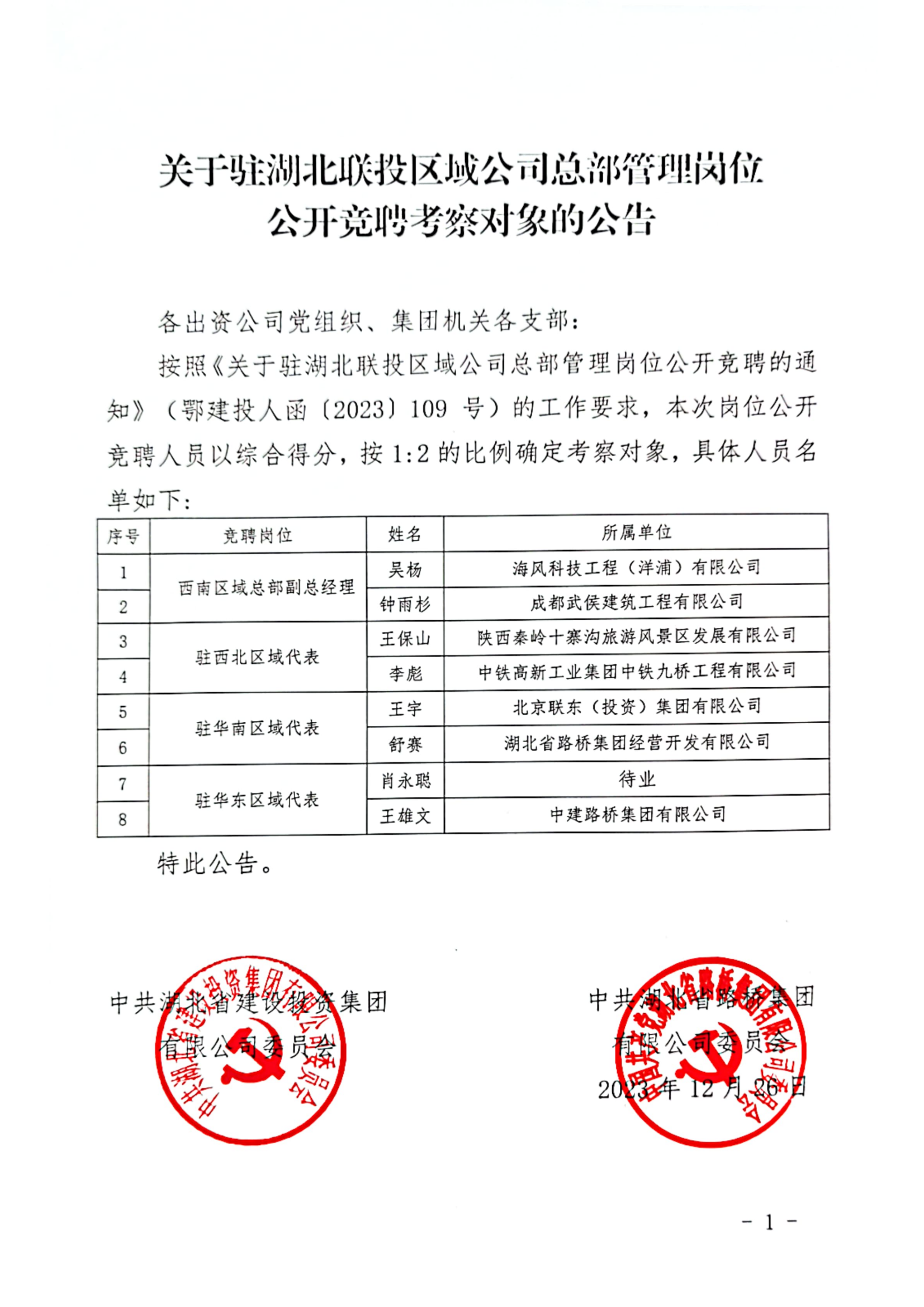 湖北省建設(shè)投資集團有限公司、湖北省路橋集團有限公司駐湖北聯(lián)投區(qū)域公司總部管理崗位公開競聘報名初審公示