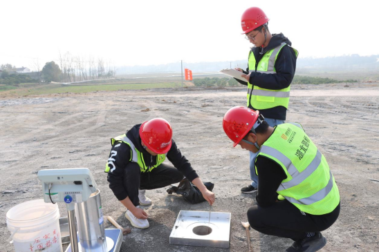 施工工藝上,團隊創(chuàng)新形成“清表碾壓-黏性土下封層-復合土工布鋪設-改性磷石膏分層填筑-精準碾壓-養(yǎng)生封層”完整流程,采用土工格柵加筋技術解決磷石膏與原路基土銜接易沉降問題,建立嚴格工序銜接機制與環(huán)保監(jiān)測方案,配套臨時排水系統(tǒng),確保施工全過程綠色可控。試驗檢測中,團隊依托灌砂法、擊實試驗等多類檢測手段,結合智能離子遷移傳感器、地下水環(huán)境監(jiān)測井等設備,實現(xiàn)路用性能與環(huán)保指標雙達標,改性磷石膏浸出液pH值穩(wěn)定在6~9之間,特征污染物濃度符合國家排放標準。
